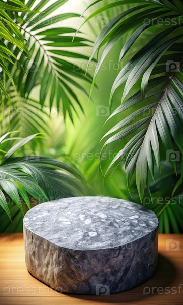 Круглая каменная поверхность, расположенная на деревянном столе в окружении пышных зеленых тропических листьев в спокойной наружной обстановке днем