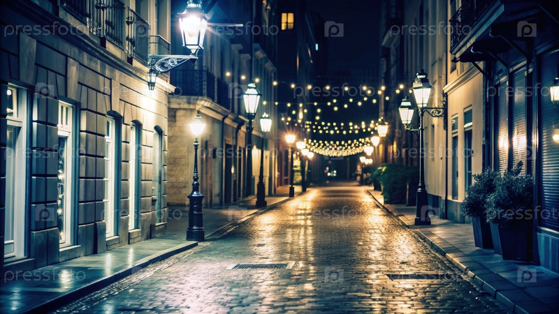 Романтическая пустая улица, освещенная старинными лампами в тихую ночь