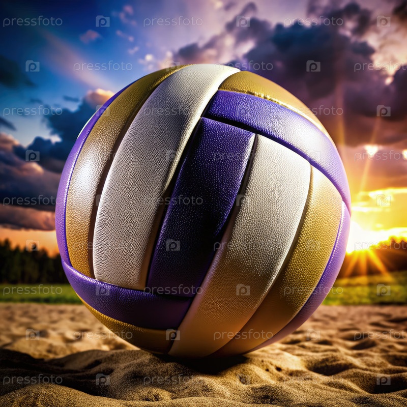 Вибрирующий волейбол, отдыхающий на песчаном поле при закате солнца, бросает теплое свечение над открытой спортивной зоной в течение прекрасного вечера