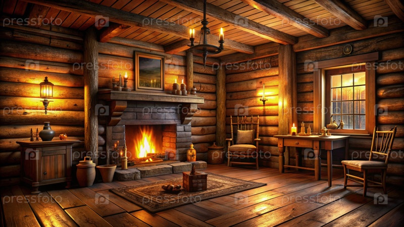 Уютная старая деревянная комната с камином и свечами, улучшающая атмосферу
