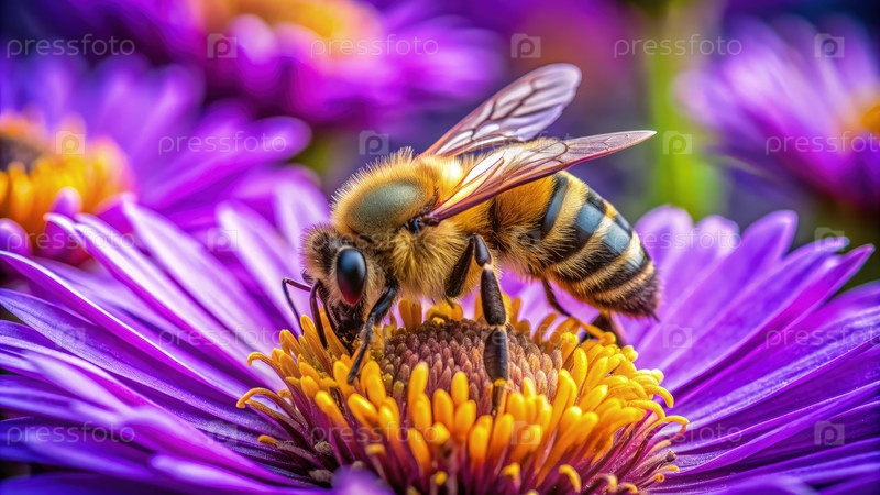 Пчела, собирающая нектар от ярко-фиолетового цветка в теплый день днем в пышном саду