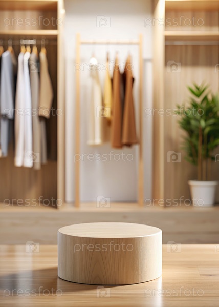 Близкий взгляд на деревянный подиум, демонстрирующий товары в современном розничном пространстве