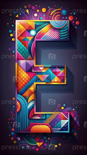 Живая геометрическая буква E украшена красочными узорами и формами на темном фоне
