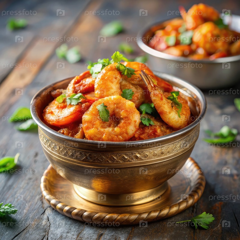 Вкусные креветки Kadai подаются в традиционной индийской чашечке на деревянном столе