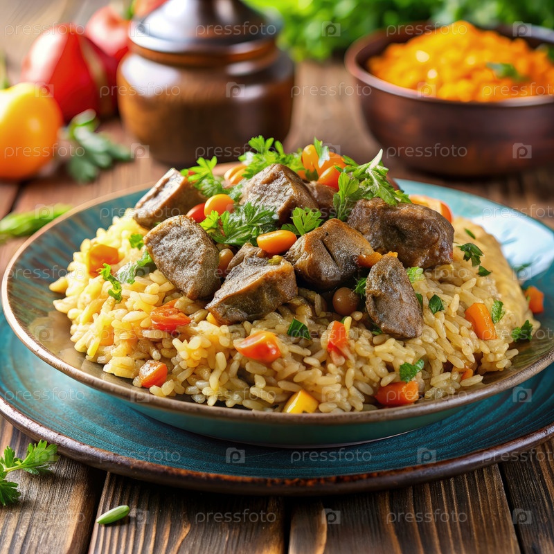 Боковой вид пилафа с тушеной говядиной, подаваемой на традиционном блюде с гарниром