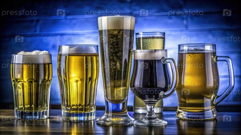 Разнообразная коллекция пивных стаканов, освещенная на драматическом синем фоне и демонстрирующая различные стили и цвета популярных напитков