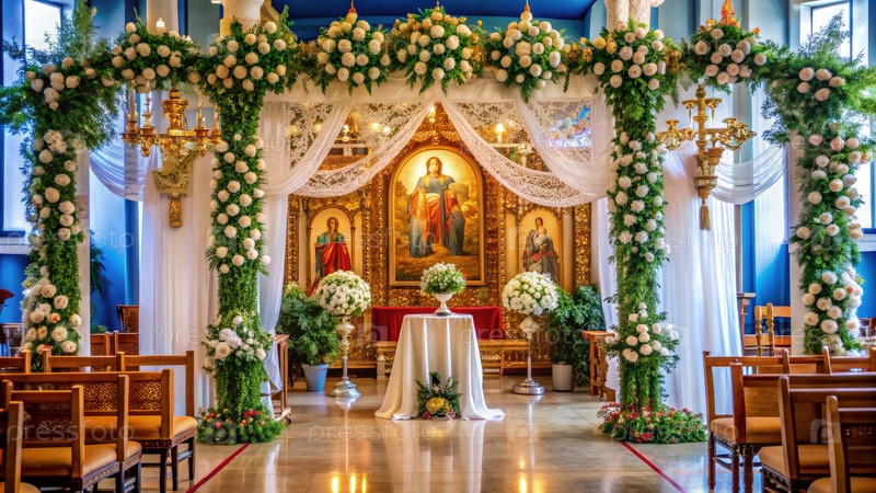 Традиционная греческая смешанная христианская свадебная сцена, украшенная цветами
