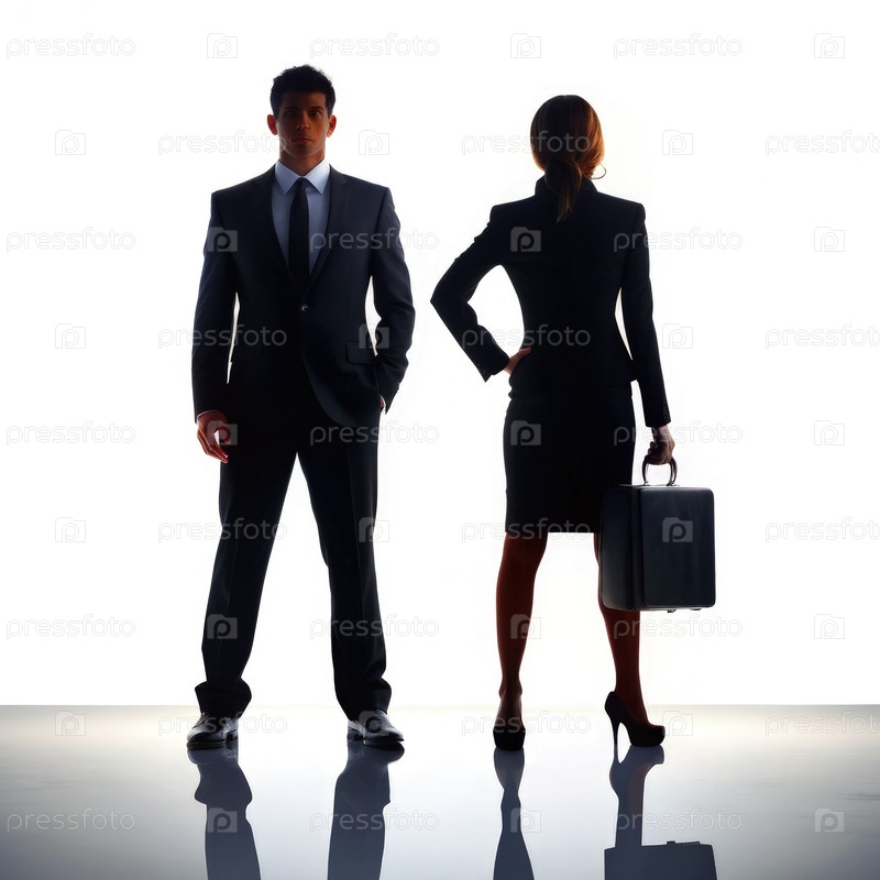 Силуэт бизнесмена и деловой женщины, стоящих бок о бок в профессиональном костюме на ярко белом фоне во время корпоративного совещания