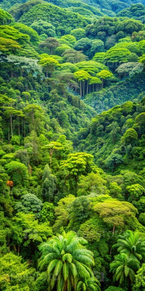 Плодородный колумбийский лес, демонстрирующий яркие деревья и разнообразную растительность под чистым голубым небом в полдень