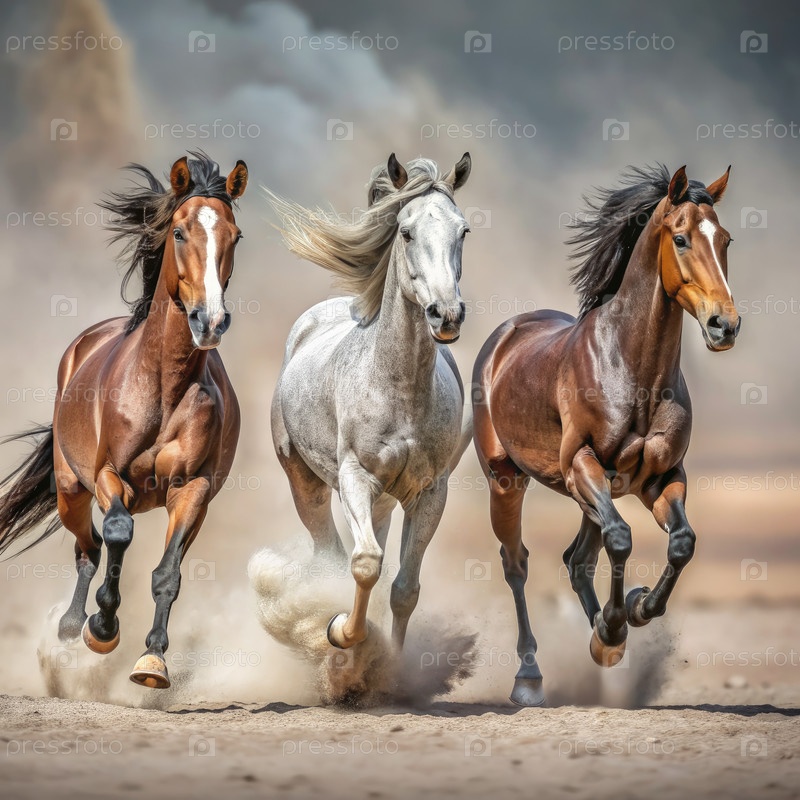Лошади галопируют мощно через пустыню, поднимая песок в захватывающую силу и скорость во время золотого часа