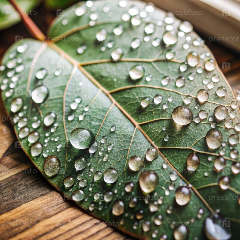 Близкий план темно-зеленого листа с капельками воды на естественном деревянном фоне