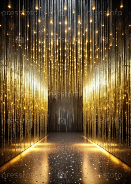 Роскошный коридор, освещенный каскадными золотыми огнями в темной обстановке
