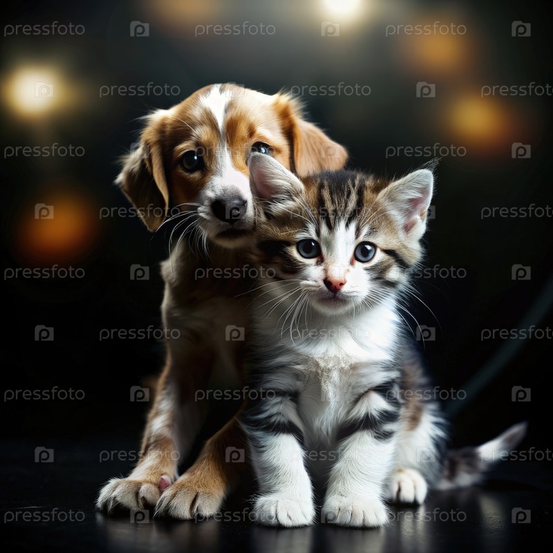 Котенок и щенка вместе позируют на темном, мягко освещенном фоне