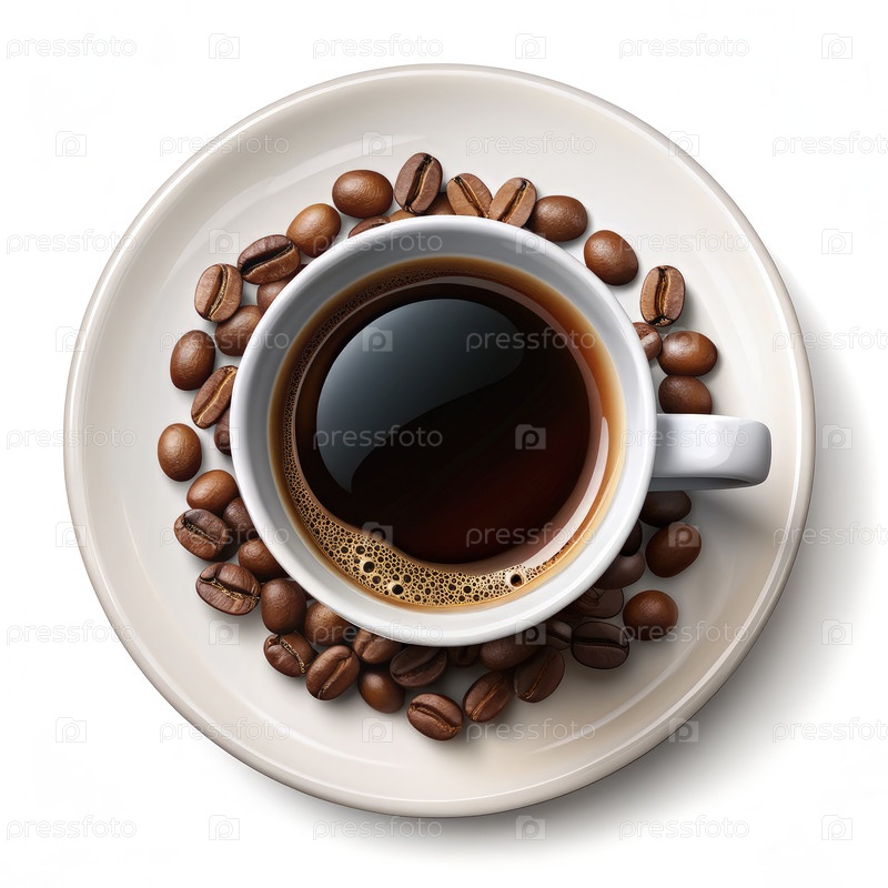 Чашка кофе, окруженная обжаренными кофейными зернами на белой тарелке