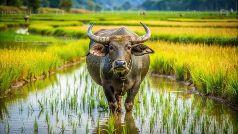 Бивол стоит в пышном рисовом поле, окруженное яркой зеленью в солнечный день в безмятежном сельском пейзаже