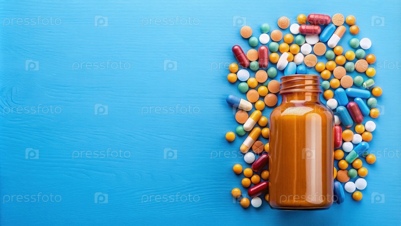 Ярко-синий фон с оранжевой бутылочкой, окруженной красочными таблетками и капсулами