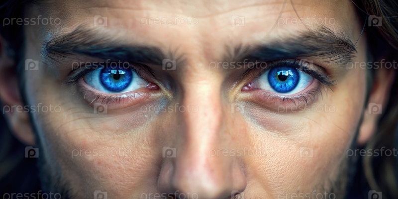 Близкий план молодого человека с ярко-синими глазами и длинными волосами на открытом воздухе в мягком свете