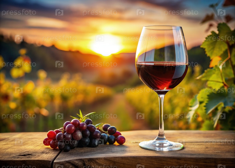 Закат солнца над виноградниками со стаканом красного вина и виноградами на деревянном столе