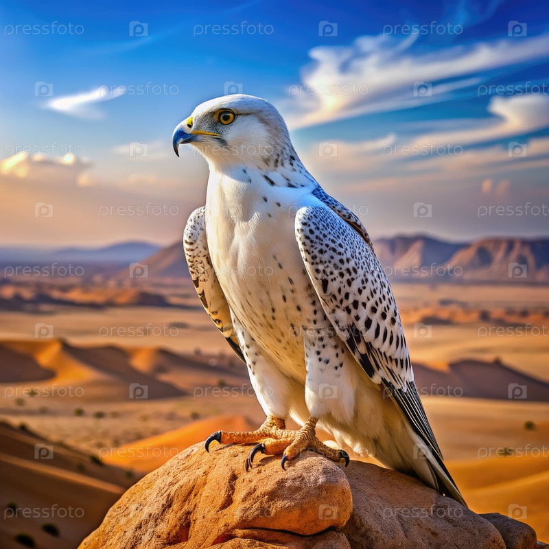 Величественный белый сокол сидит на скале в пустыне во время захода солнца