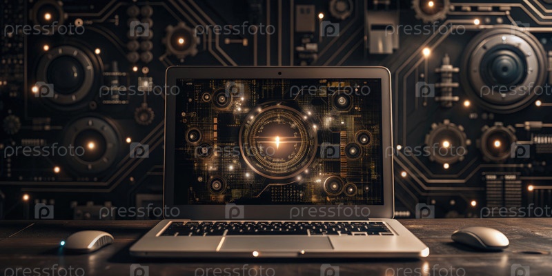 Утонченный ноутбук с сложными схемами, расположенный на темном технологическом фоне в современной рабочей среде