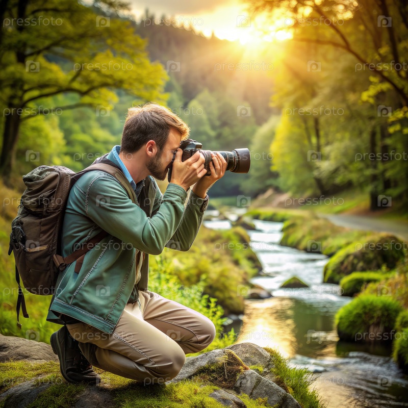 Фотограф, захватывающий живописный вид по потоку во время золотого часа