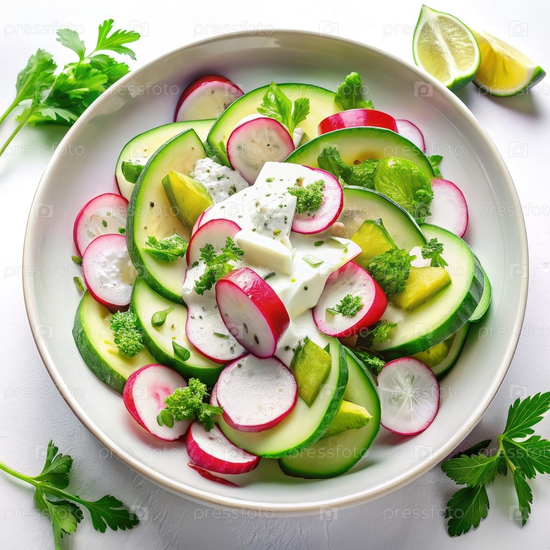 Свежий вегетарианский салат с редисами, огурцами и травами подается в миске