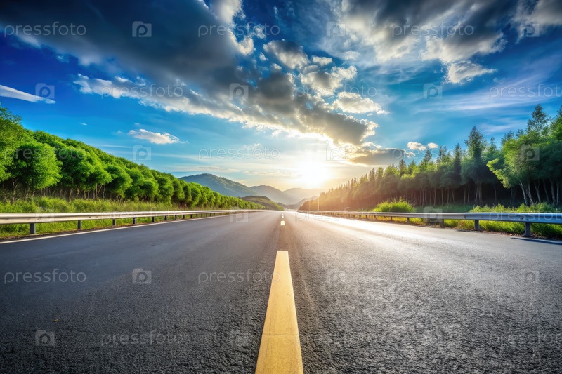 Пустая дорога простирается в сторону далеких гор под ярким закаточным небом