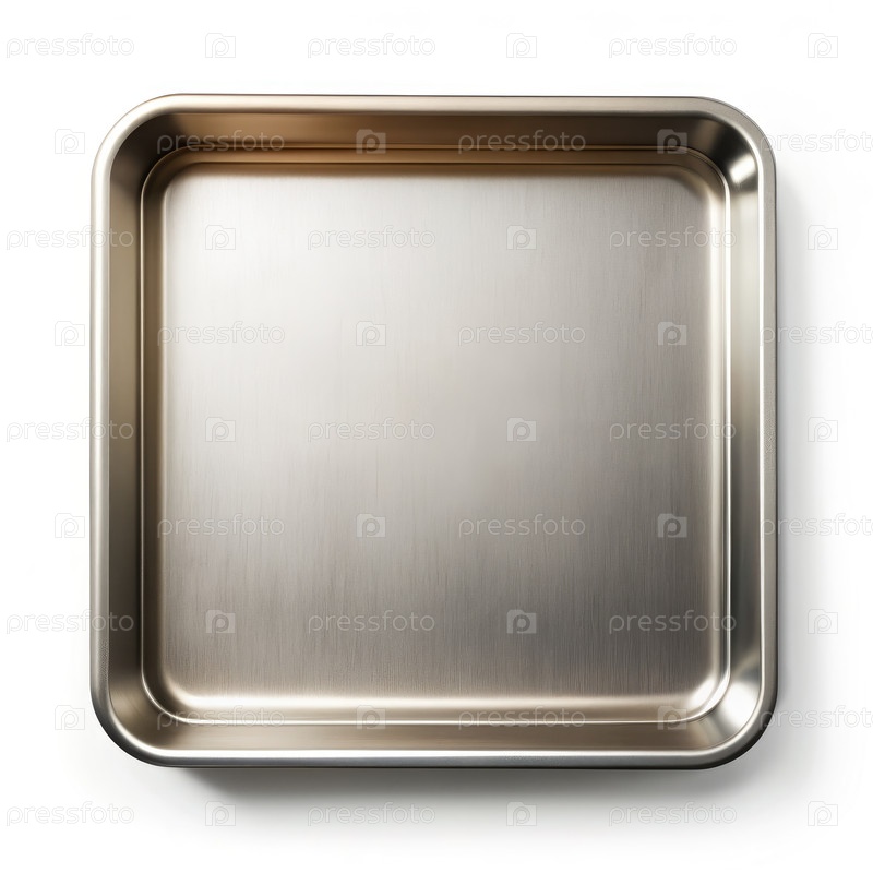 Пустой стальной поднос отображается сверху на белой поверхности для кулинарного использования и кухонных задач