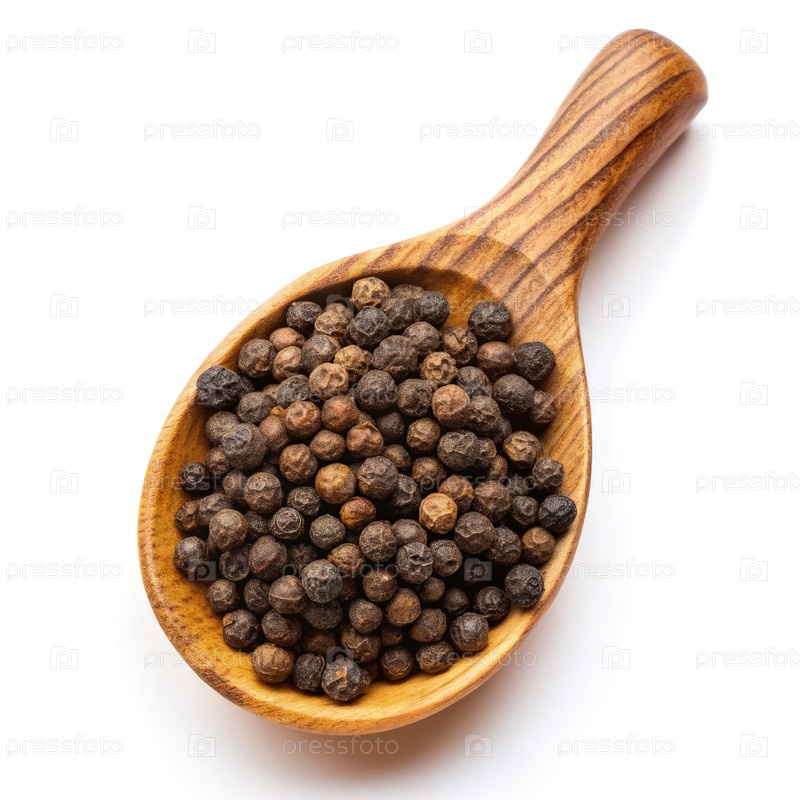 Вид сверху ароматических зерен черного перца, отдыхающих в деревянной ложке на ярко-белом фоне, демонстрируя их естественную текстуру и цвет