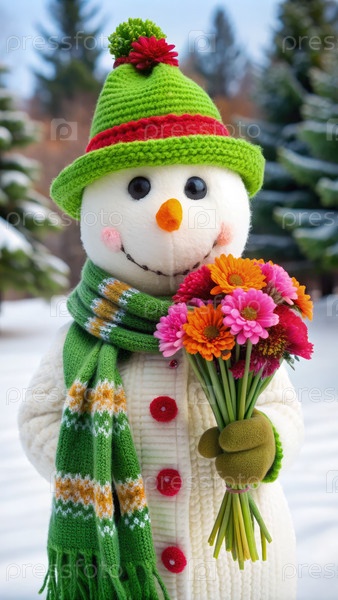 Веселый снежный человек в зеленом шарфе стоит на снежном ландшафте и радостно держит яркий букет зинний зимой