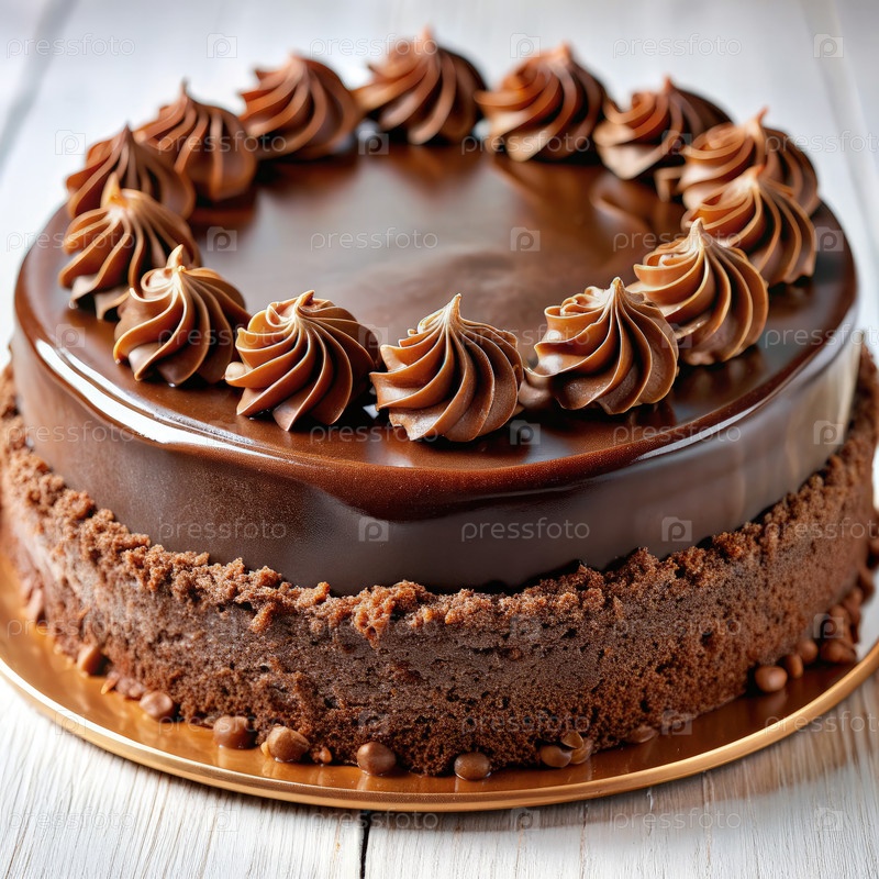 Вкусный круглый шоколадный торт, украшенный богатыми вихрями глазури, идеально подходит для празднований и подается на деревянном столе при мягком освещении