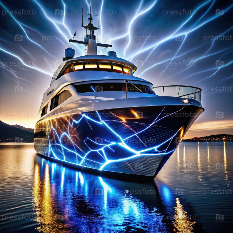 Элегантная яхта с поразительным флеш-моделем, пришвартовавшаяся при закате солнца на спокойных водах