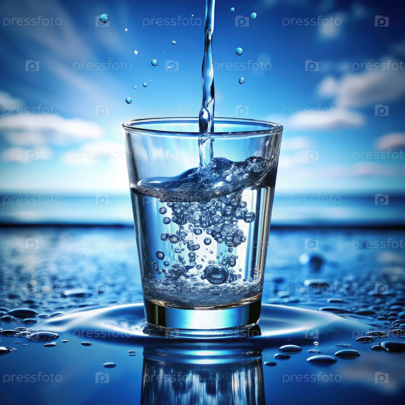 Чистая вода наливается в стакан на ярко-синем фоне