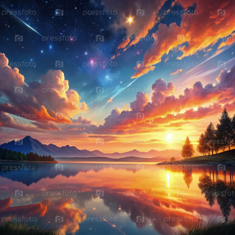 Яркий закат солнца отражается над тихим озером, окруженным горами и деревьями
