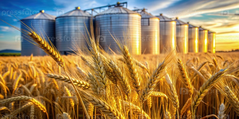 Ближайший план золотой пшеницы, мягко раскачивающейся в ветре с современными силосами вне фокуса под ярким закатом солнца в сельской местности