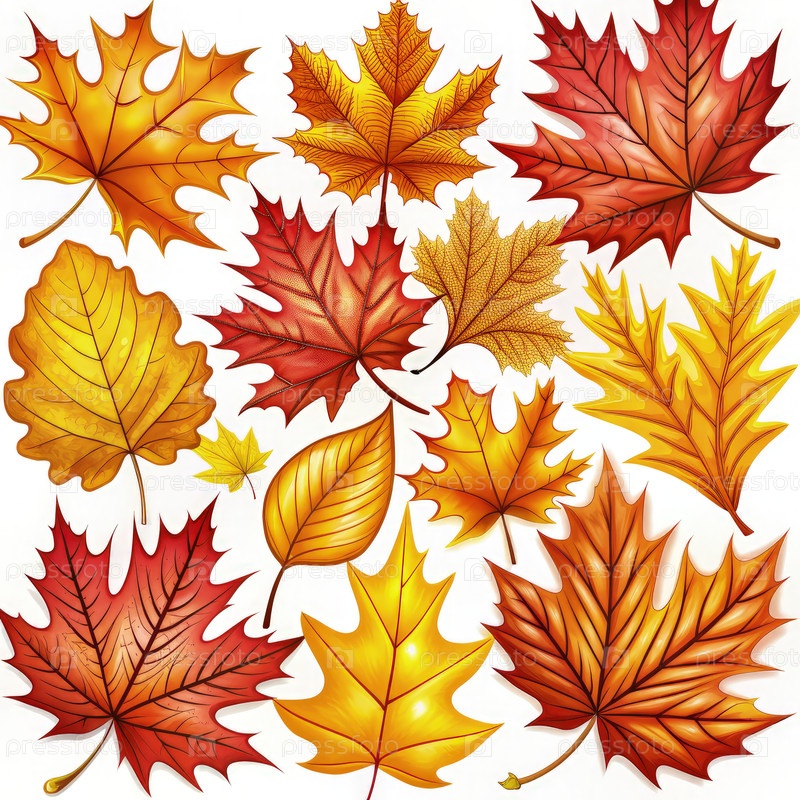 Живые подробные иллюстрации кленовых листьев осенними цветами на белом фоне
