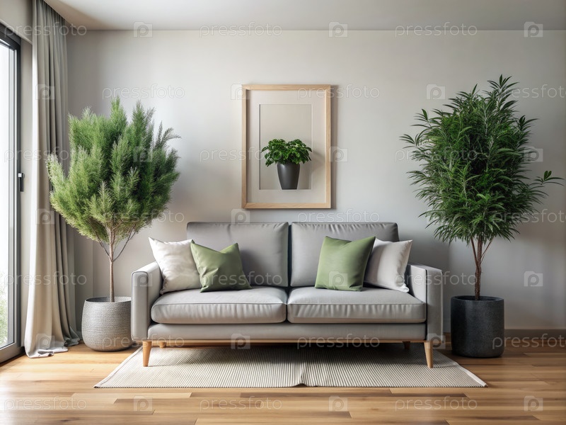Уютная гостиная со светлыми деревянными полами и зеленой средой, с диваном и декоративными растениями