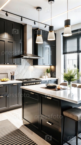 Элегантный черно-белый дизайн кухни с современными бытовыми приборами, стильным освещением и гостеприимной атмосферой для кулинарных мероприятий