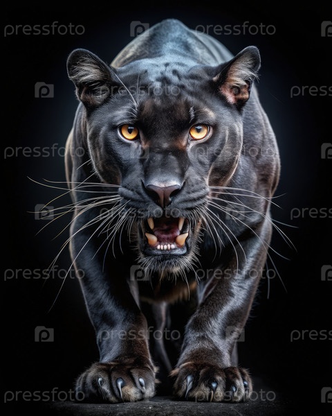 Агрессивная пантера бродит на темном фоне, демонстрируя свою мощную форму и интенсивный взгляд в поле зрения