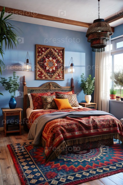 Уютная спальня бохо с ярким декором и природными элементами