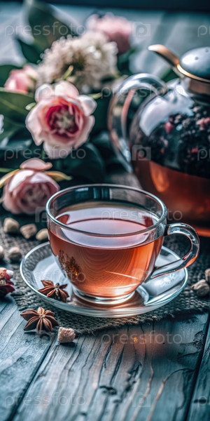 Теплая чашка чая с свежими цветами и чайник на деревянном столе