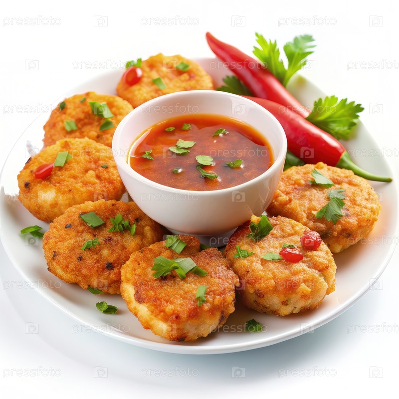 Тайские креветочные пироги подают со сладким чили-соусом и свежими травами