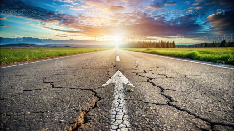Долгое путешествие по треснувшей асфальтовой дороге под ярким небом на закате