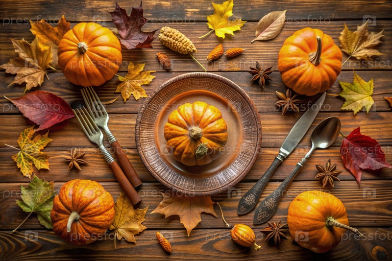Уютная осенняя столовая обстановка на День благодарения с мини-выносными тыквами, красочными листьями и деревянной посудой