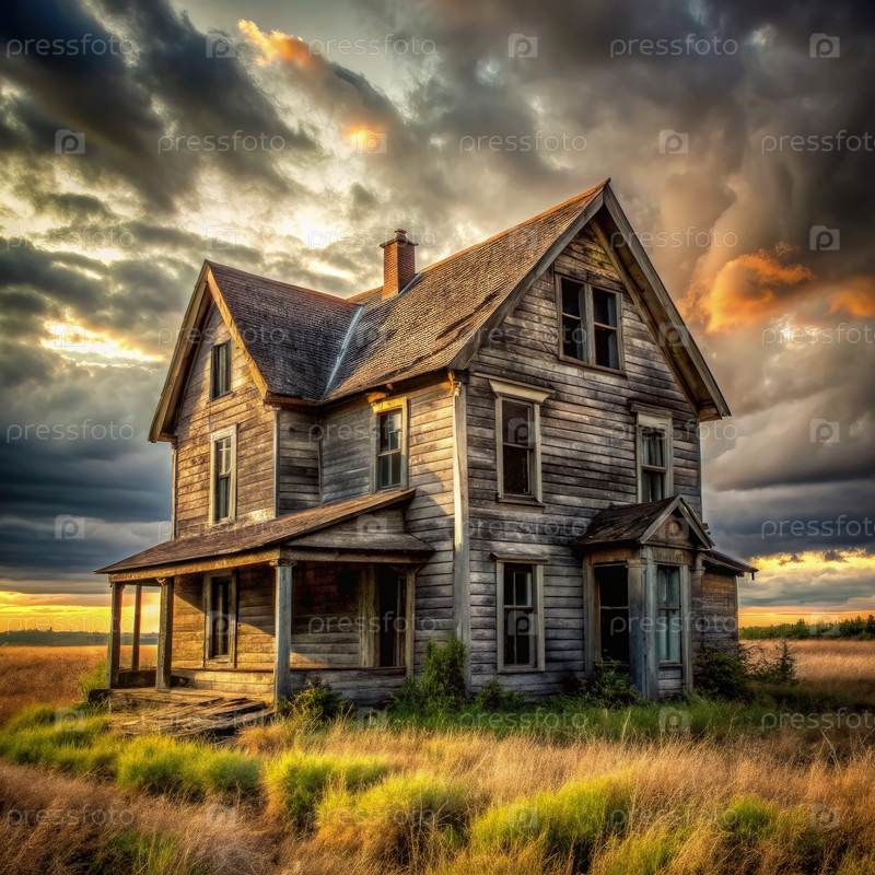 Заброшенный деревянный дом на закате, окруженный заросшей травой под драматическим небом в сельском пейзаже