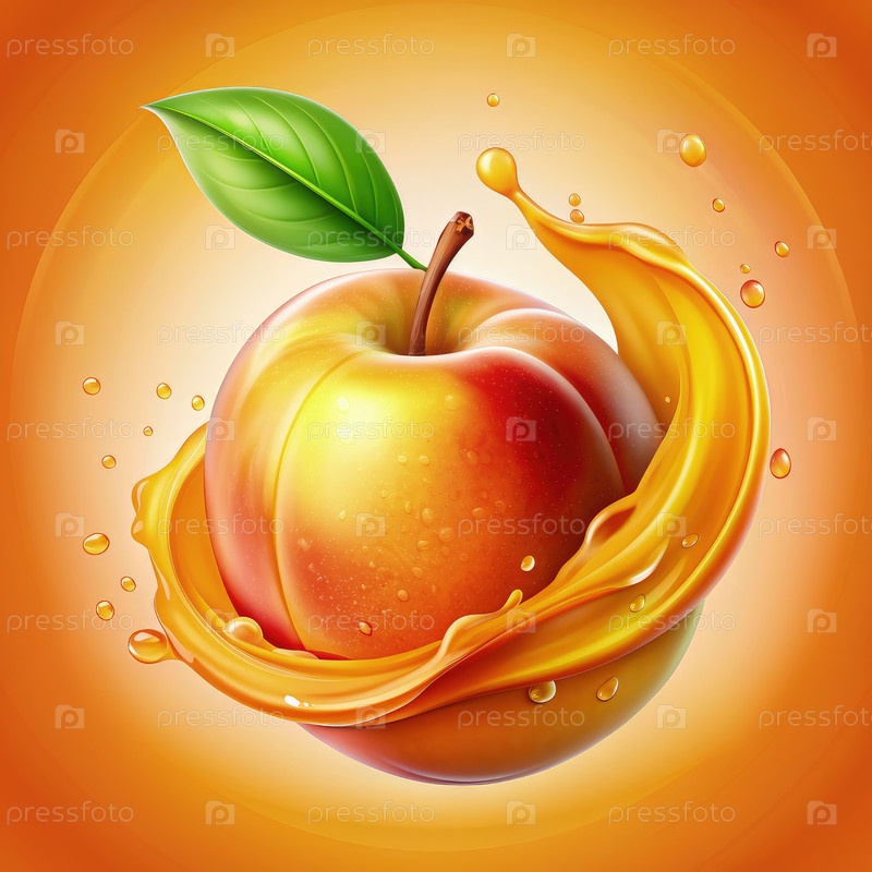 Цветный сочный персиковый логотип с эффектом брызги на ярком оранжевом фоне