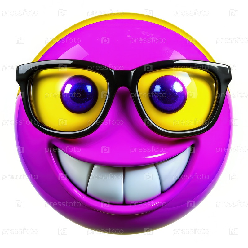 Счастливый фиолетовый эмодзи с очками, ярко улыбающийся на ярком фоне