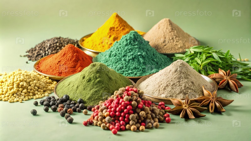 Красочный массив специй и трав, изящно расположенных на зеленом фоне