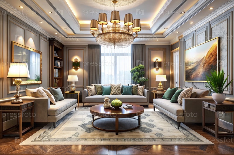 Элегантная гостиная с современным декором и естественным светом в дневное время