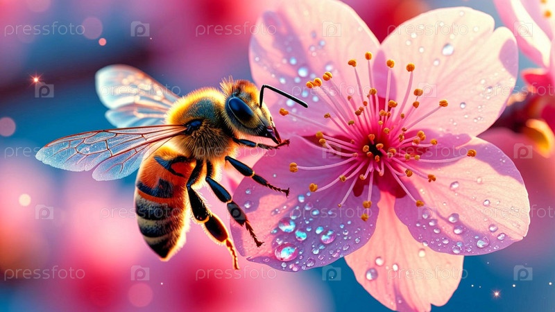 Макрофотография пчелы, собирающей пыльцу с цветка на яблони. Пчела опыляет цветок